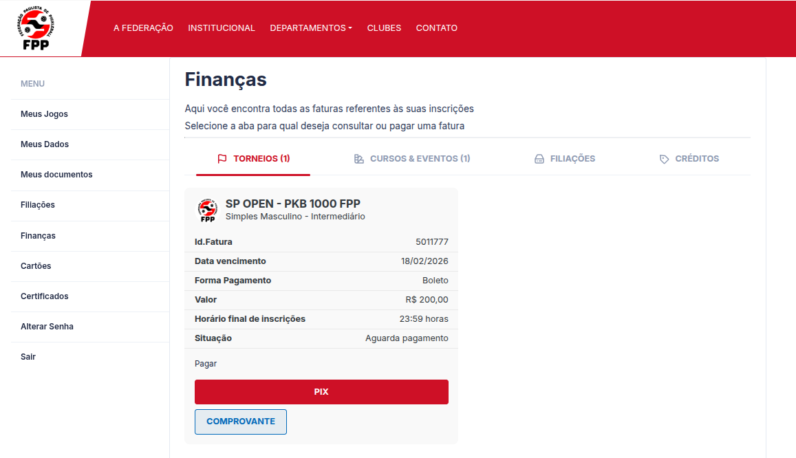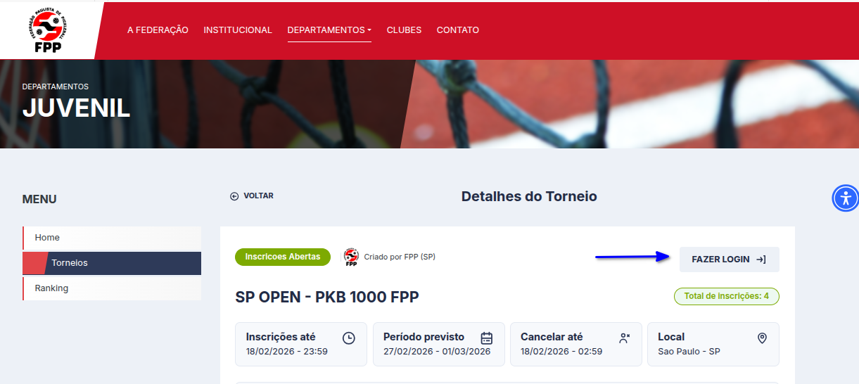 Após encontrar o torneio no qual deseja se inscrever, será necessário fazer login no sistema.