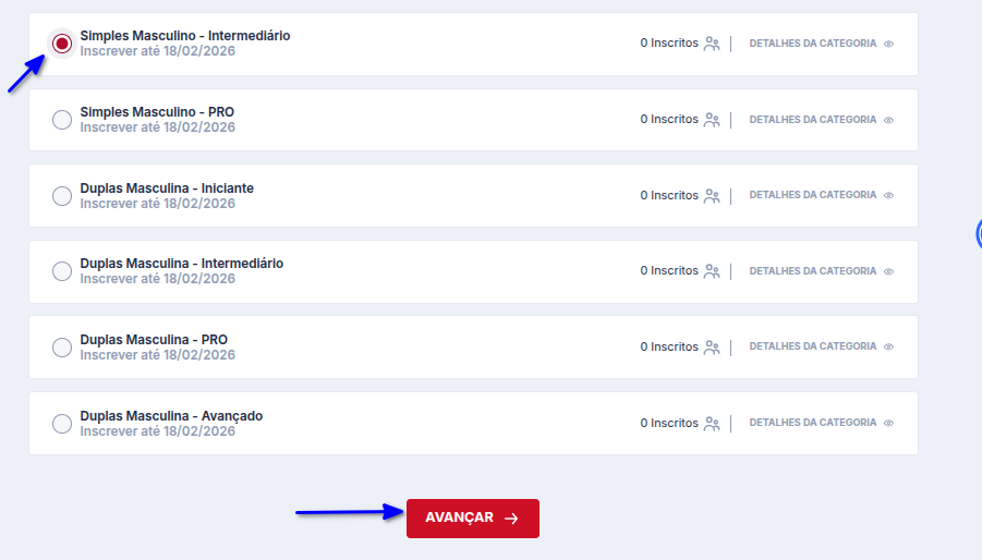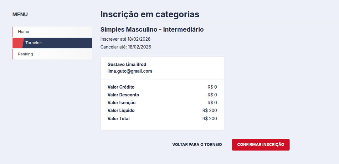 Verifique as informações da inscrição na categoria selecionada e clique em Confirmar inscrição.